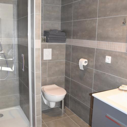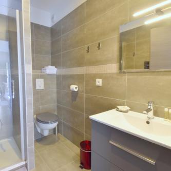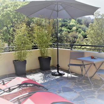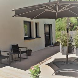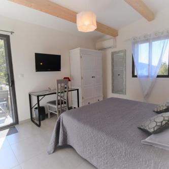 STELLA : Chambre de 20 m2 située à l'étage avec lit 160 x 200, TV écran plat, armoire avec étagère et penderie, petit réfrigérateur, bouilloire, salle d'eau privée : douche à l'italienne, vasque, wc, sèche serviette, terrasse 12 m2, climatisation, wifi.