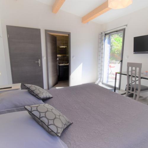 STELLA : Chambre de 20 m2 située à l'étage avec lit 160 x 200, TV écran plat, armoire avec étagère et penderie, petit réfrigérateur, bouilloire, salle d'eau privée : douche à l'italienne, vasque, wc, sèche serviette, terrasse 12 m2, climatisation, wifi.
